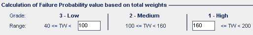 Under Calculation of Failure Probability value based on total weights, define the boundaries between different Failure Probability values. To define these boundaries, type the relevant values in the Low and High fields.