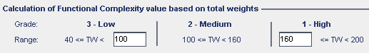 Under Calculation of Functional Complexity value based on total weights, define the boundaries between different Functional Complexity values. To define these boundaries, type the relevant values in the Low and High fields.