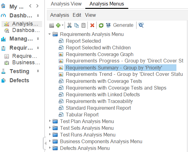 For example, if you create a requirement summary graph, named Requirements Summary - Group by Priority, in Analysis Menus, users can directly generate the graph from within the Requirements module > Analysis menu.