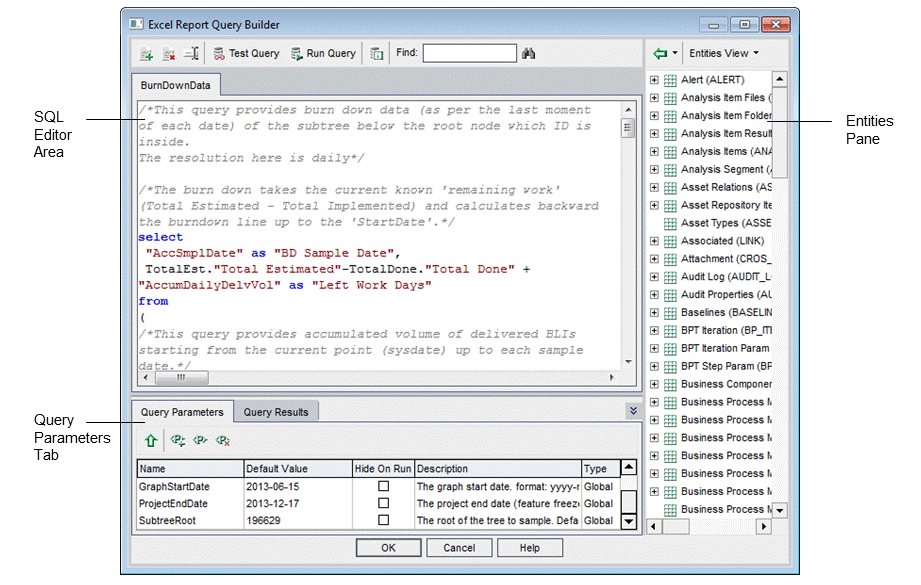 Define the project data that you want to include in the report. You define this data by creating SQL queries. You can create multiple queries in an Excel report. When you generate the report, the results of each query are displayed in separate Excel worksheets.