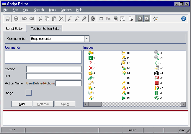 1. In the Script Editor, click the Toolbar Button Editor tab.