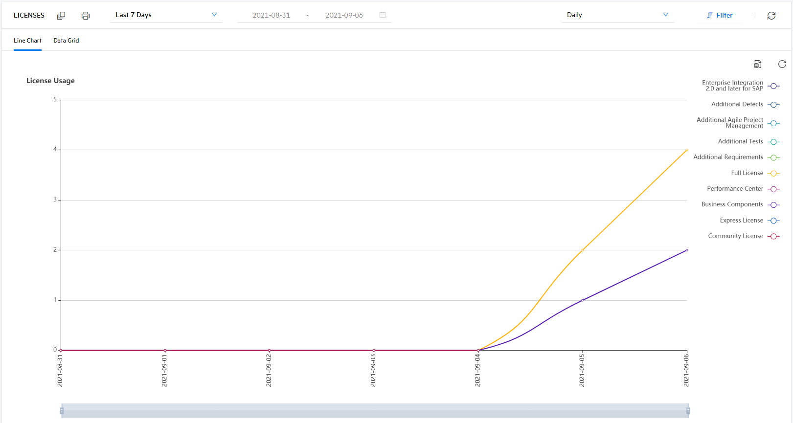 | License types | To filter by license types, switch the report to the Line Chart view, and click the legends of the license types you want to hide. |
