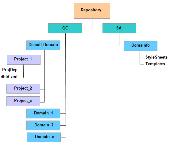 The qc directory is a working area for a group of domains that are shared by multiple users. Each domain stores projects. When you create a new project, you can add it to the default domain or to a user-defined domain. Under the qc directory, each project directory contains the following subdirectories: