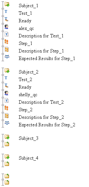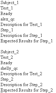 When the data are provided as paragraphs, each field of the test plan must be on a separate line. For each subject folder, the name of the subject folder must appear first. The tests of that subject folder must appear under the name of the subject folder. The test steps of each test must appear under the test. The following example shows the data for two subject folders, each with one test containing one test step.