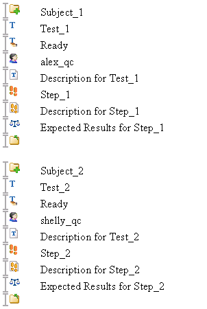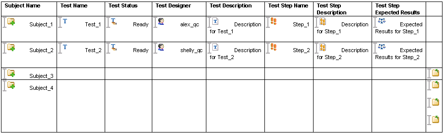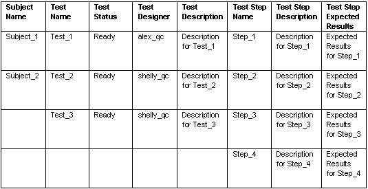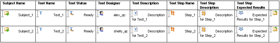 You can export subject folders, tests and test steps. For a test you can export the test name, status, designer, and description. For a test step you can export the test step name, description, and expected results.