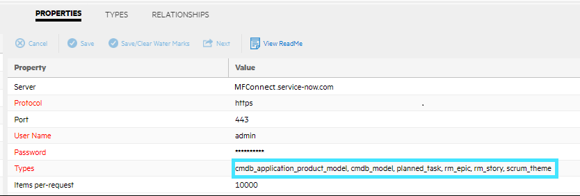 Edit the fields in bold. The USER and PASSWORD are the ones used for Connect. The DATA_SOURCE is the name of the ServiceNow data source that you created, and the TYPE is a type to be synchronized. PROPERTY is optional. For example: