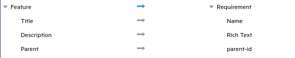 Add another type to map, and this time choose Feature on the left and Requirement on the right. Ensure the arrow at the type level is again set to To Master.