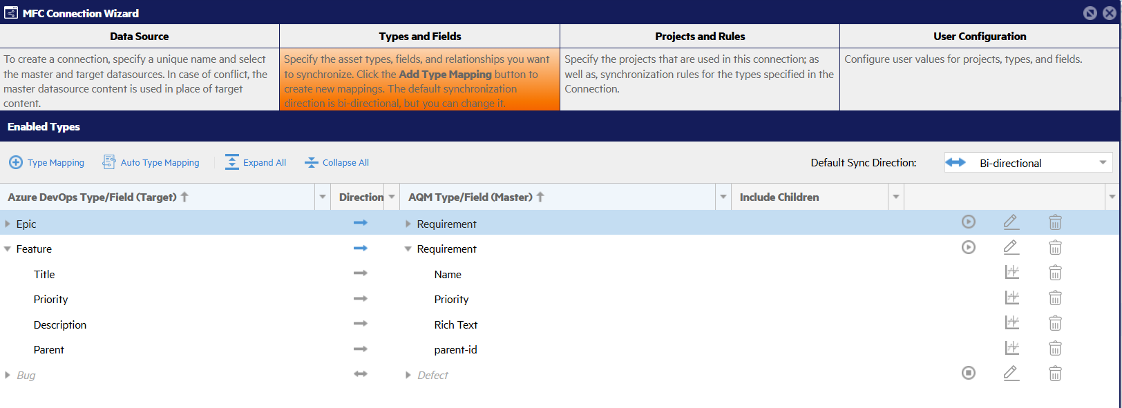 Select Feature on the left and Requirement on the right side. Change the direction of the type mapping to be To Master. This means that features originate in Azure DevOps and sync to OpenText Application Quality Management.