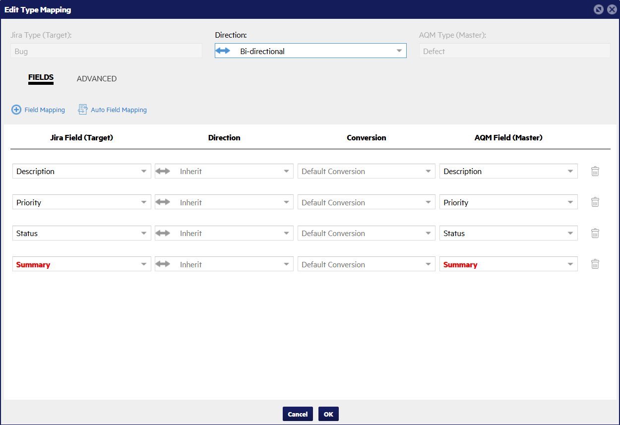 Although this use-case pushes stories from Jira to OpenText Application Quality Management, you want to allow users to also update these fields and push updates to Jira, so you edit these fields to be bi-directional.