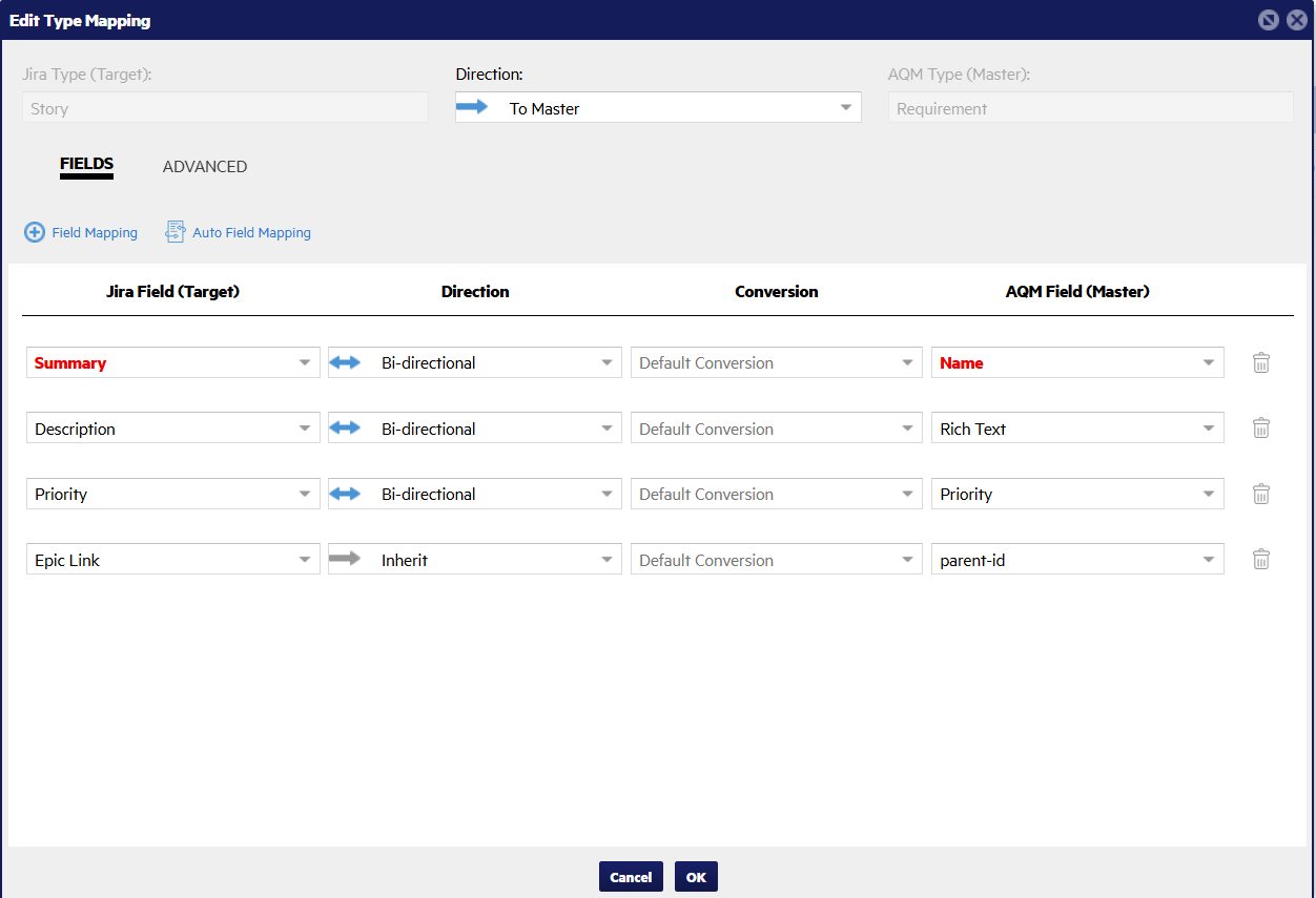 The only exception is the Epic Link field, which is uni-directional to the OpenText Application Quality Management parent-id field. This is a relationship field that indicates which Epic/Requirement will be a parent of any given Story/Requirement.