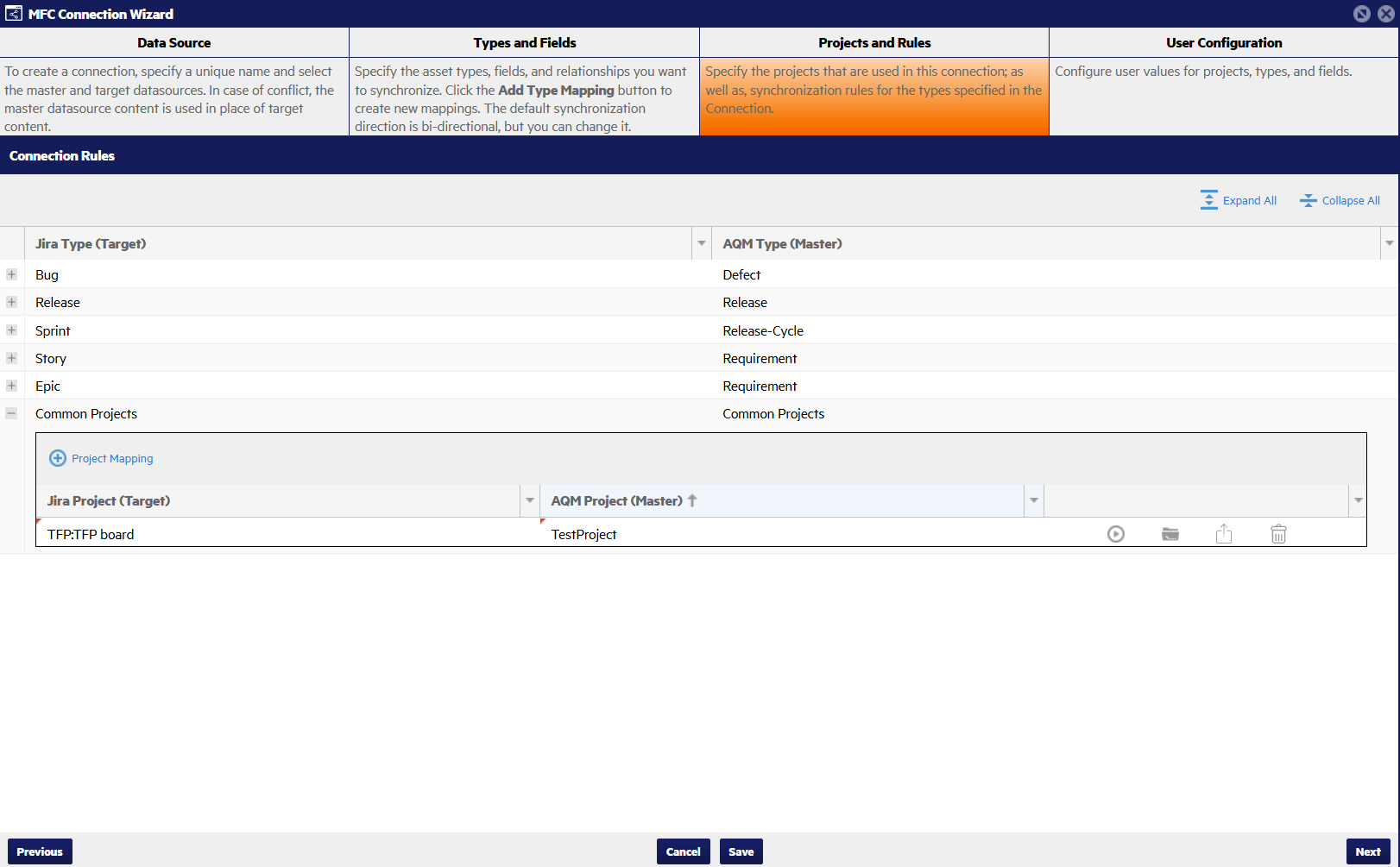 If you map projects under the Common Projects heading, then all the types being synchronized will apply to the same two projects. In our use-case, stories/requirements, bugs, epics/requirements, releases, and sprints/release cycles will all be synchronized in the sample projects.