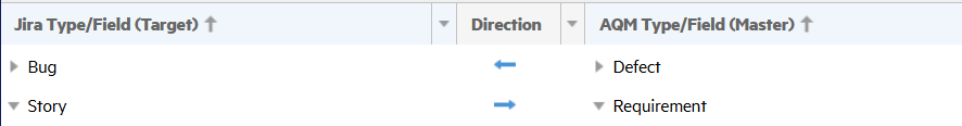 Our use-case creates stories in Jira and pushes them to requirements in OpenText Application Quality Management. Click + Type Mapping and select Story on the Jira side, and Requirement on the other side. Set the direction from Jira to OpenText Application Quality Management.