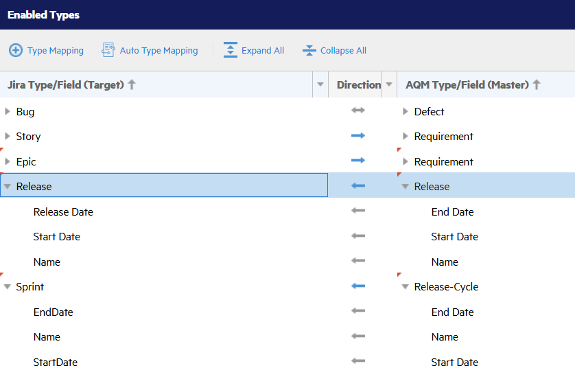 Our use-case also adds releases and sprints/release cycles using the above steps. You add each type, and map them as uni-directional to Jira. (None of their fields need to be value-mapped.)