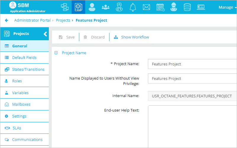 Enter the SBM Project(s) name, as defined within the Application Administrator as the project's Internal Name. Separate multiple project names with a semicolon. Add the suffix :1 to include all defined sub-projects. This only applies to projects associated within the SBM Table/SBM Workflow definition.