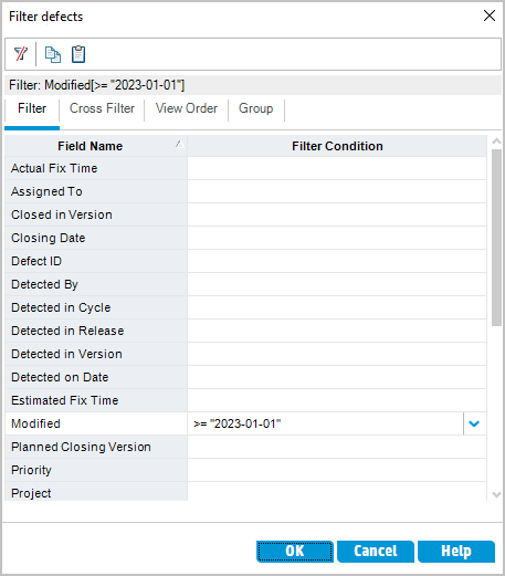 If you encounter issues when using an OpenText Application Quality Management filter with a date field, use the format YYYY-MM-DD in the filter. For example:
