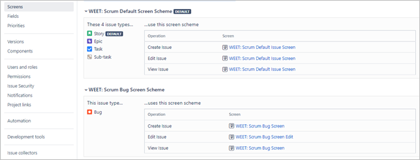 For each Jira issue type that you are synchronizing, determine the fields that are exposed by clicking on the Associated Scheme for the Create and Edit screens. The scheme for Create and Edit can be different, depending on your JIRA configuration. The following example shows differences between Create and Edit screens for different schemes: