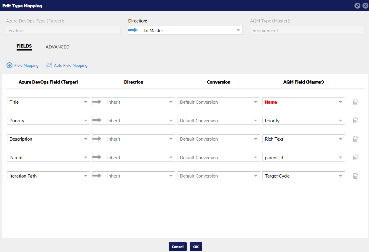Add a new type mapping for Azure DevOps iterations with OpenText Application Quality Management release cycles. For this example, set the direction to From Master with the following fields.