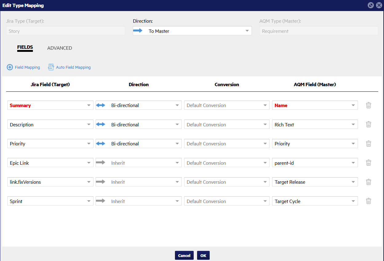 Although this use-case pushes stories from Jira to OpenText Application Quality Management, you want to allow users to also update these fields and push updates to Jira, so you edit these fields to be bi-directional.