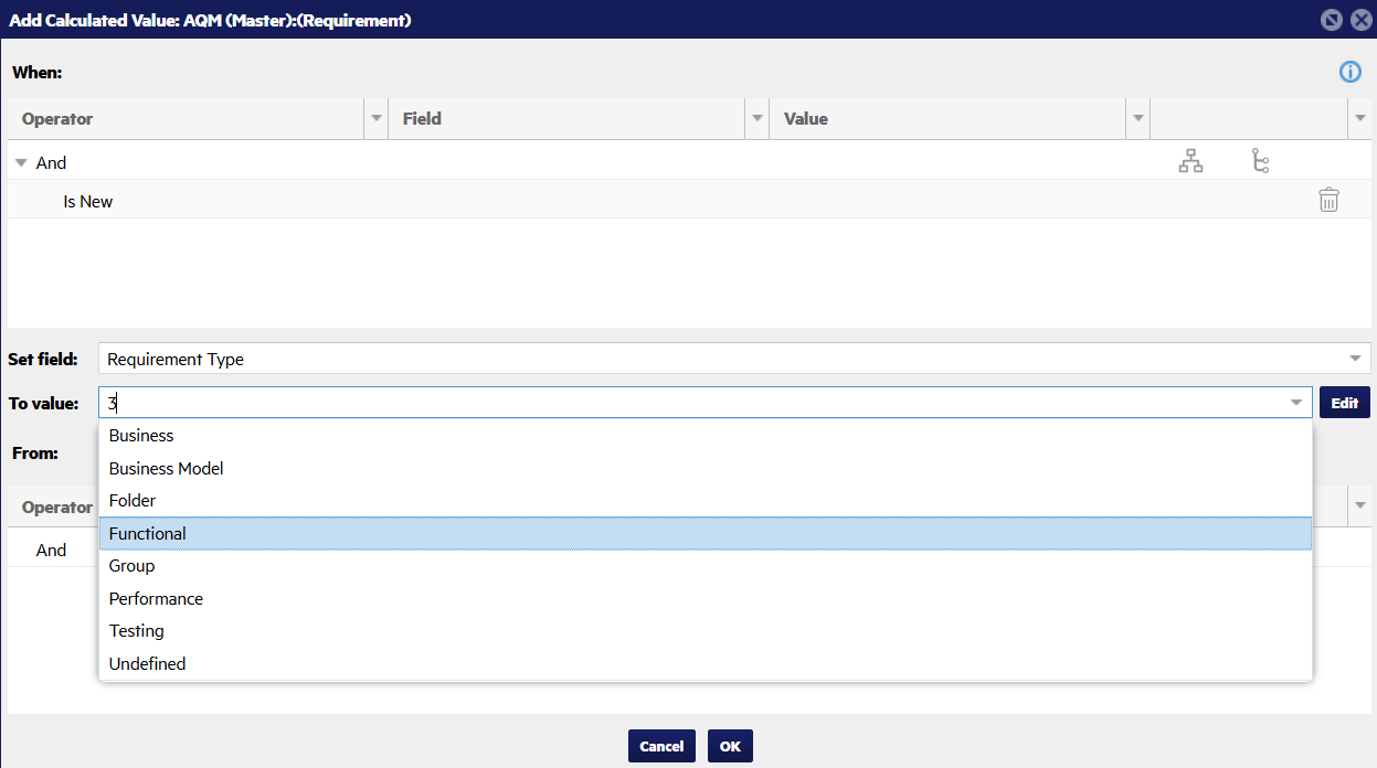 Note: After you select Functional, an integer appears in its place. This is the correct behavior, as OpenText Application Quality Management stores these types as integers.