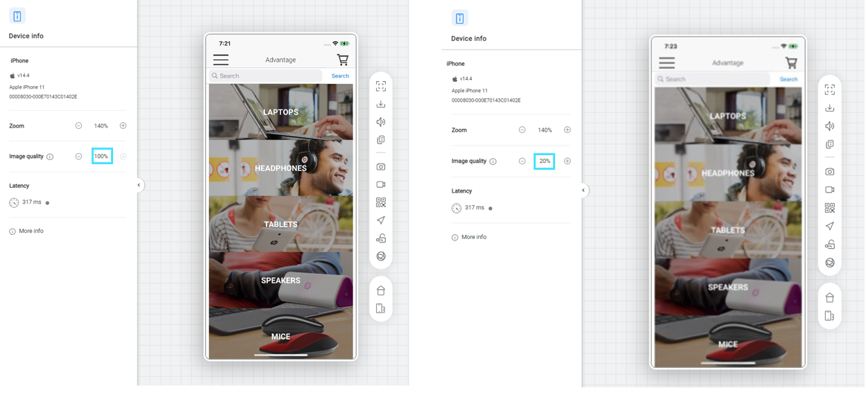 The Device screen image quality settings allow administrators to control the default quality of the device image displayed in the remote view, and to limit the maximum quality that a user can select. This may help to prevent network congestion on networks with not enough bandwidth. For more details on image quality, see Device info in Device access window.