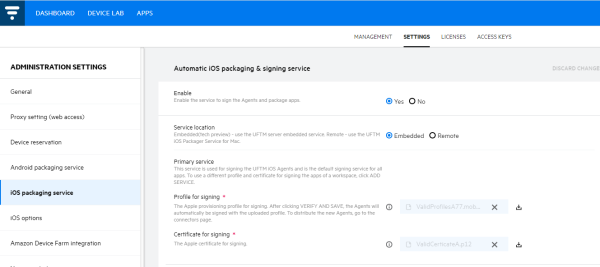 UFT MobileサーバーにはiOSパッケージングサービスが組み込まれており、署名アセットはUFT Mobileコンソールから管理されます。管理設定 > iOSパッケージングサービスで、組み込みパッケージングサービスを構成し、署名アセットを管理できます。詳しくはiOS署名サービスを参照してください。