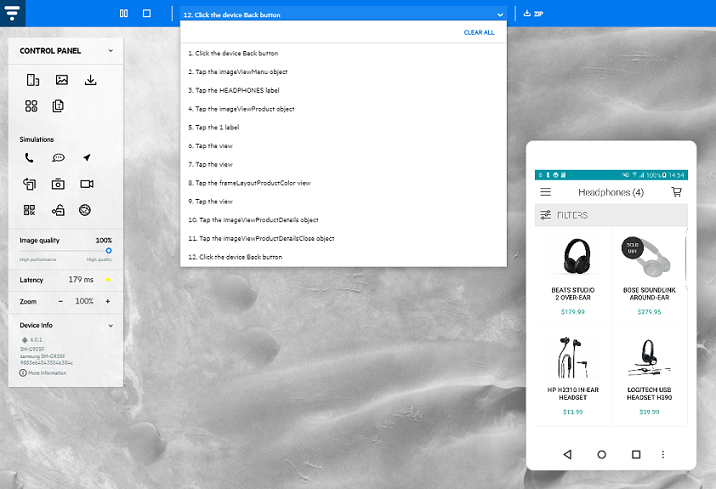 これで、デバイスを録音モードでリモートで開き、手動の手順を録音することができます。手動テストセッションの最後に、デバイスで実行されたアクションの自動生成されたトランスクリプトを含むレポートを、スクリーンショット、デバイスログ、およびテストの詳細とともにダウンロードします。レポートを使用して、不具合またはテストケースを作成します。詳細については、デバイスアクセスウィンドウを参照してください。