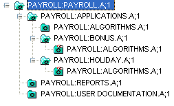 Example: This product, called Payroll, includes three design parts: Applications, Reports, and User Documentation. Each design part can have child design parts. For example, Algorithms, Bonus, and Holiday are children of the Applications design part.