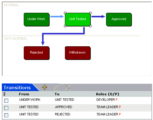 The following lifecycle for a source file has the Unit Tested state selected. Normally, an item reaches that state when a developer actions the item from the Under Work state. Only a Team Leader can then action the item from Unit Tested to Approved. The only other transition possible from Unit Tested is to Rejected, which only a Team Leader can make.