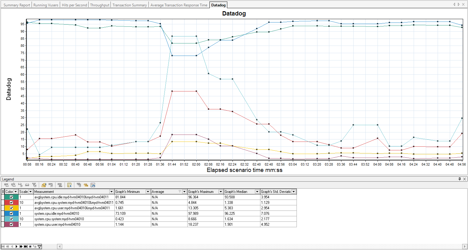 When a metric is showing aggregated results from more than one host, the names of all hosts are included in the Measurement column in the legend. The aggregation method is indicated in the metric name, for example, avg:metric1.