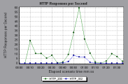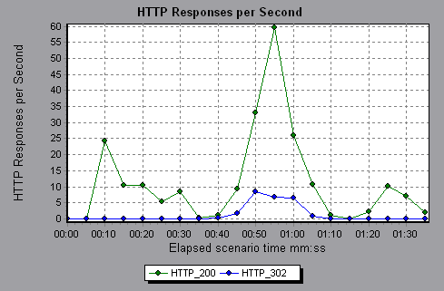 In the following example, the greatest amount of 200 status codes, 60, was generated 55 seconds into the scenario run. The greatest amount of 302 codes, 8.5, was generated 55 seconds into the scenario run.
