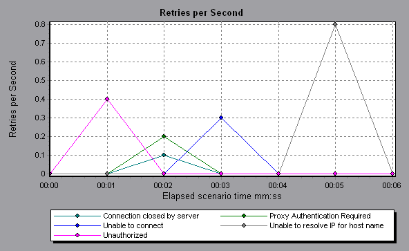 The Retries per Second graph displays the number of attempted server connections during each second of the load test scenario run. A server connection is retried when: