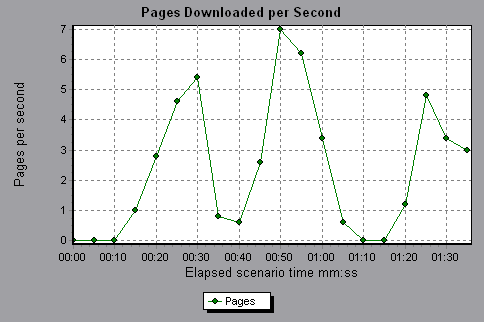 Example: In the following example, the greatest number of pages downloaded per second, about seven, occurred 50 seconds into the scenario run.