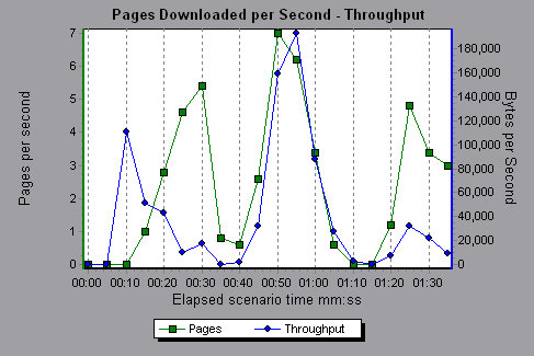 Like the Throughput graph, the Pages Downloaded per Second graph represents the amount of data that the Vusers received from the server at any given second. However, the Throughput graph takes into account each resource and its size (for example, the size of each .gif file or the size of each web page). The Pages Downloaded per Second graph takes into account only the number of pages.