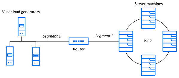 The following diagram shows a typical network. To go from the server machine to the Vuser machine, data must travel over several segments.