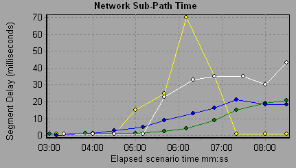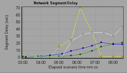 The Network Segment Delay Time graph shows the delay (in seconds) for each segment of the path according to the elapsed load test scenario time. Each segment is displayed as a separate line with a different color.
