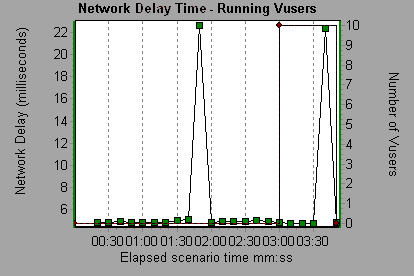The Network Delay Time graph shows the delays for the complete path between the source and destination machines (for example, the database server and Vuser load generator). It maps the delay as a function of the elapsed load test scenario time.