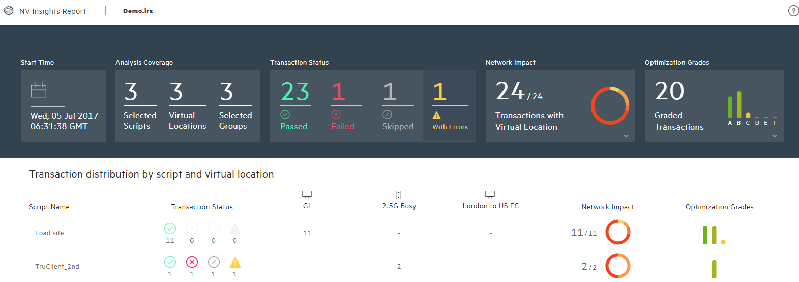 The dashboard includes both summary widgets with data from the entire run, and a breakdown of data by script and location. The dashboard illustrates the impact of different networks on transaction duration, and shows optimization grades that include links to optimization recommendations for your applications.