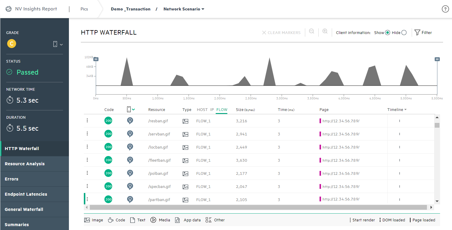 The HTTP Waterfall page includes both a graph and a table. The graph displays throughput values. The table displays the list of requests and resources sent over the network.