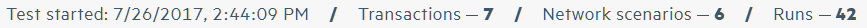 The value for Runs indicates the total number of transactions that ran in the test multiplied by the total number of network scenarios (virtual locations). In Chart view, Runs equals the total number of bars, and in Grid view, Runs equals the total number of rows.