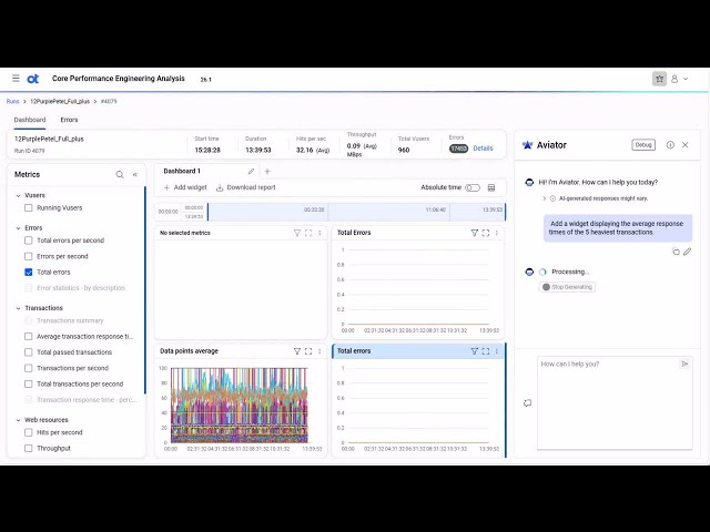 When used together, these features save time and reduce the skill sets required for scripting. For details, see Aviator for Scripting in the OpenText Virtual User Generator Help Center. AI-driven data analysis Aviator for Analysis in Core Performance Engineering Analysis is generally available for all users. It includes the following key capabilities: