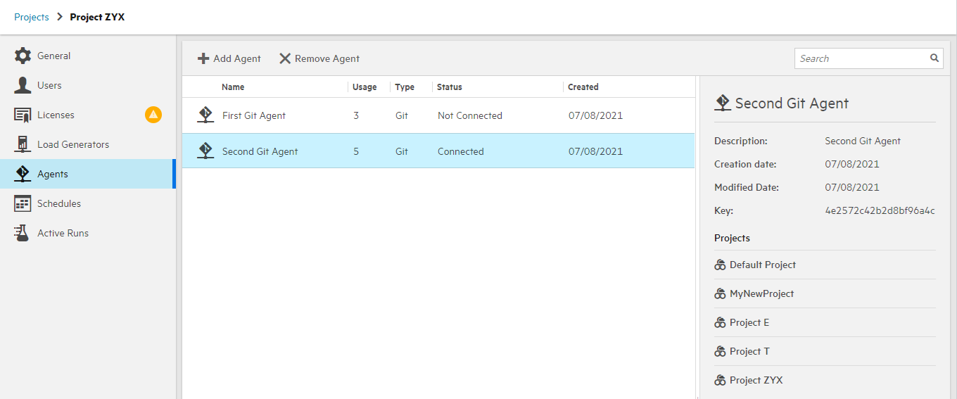 To add and remove on-premises load generators for your projects, choose a project and click Load Generators