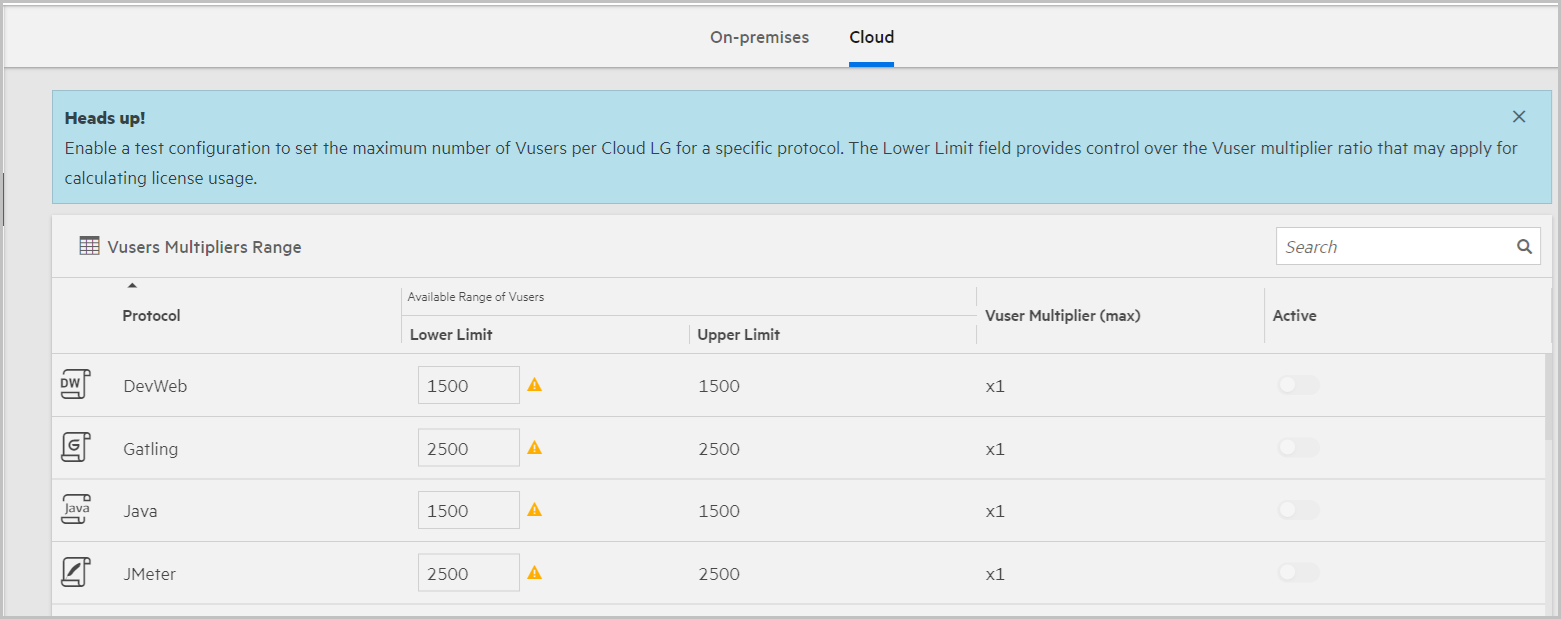 This capability is off by default. To enable it, you must submit a service request. After this capability is enabled, you can activate or deactivate protocols for each project, and set the lower limit of Vusers per protocol. For details, see Cloud LG infrastructure capacity.
