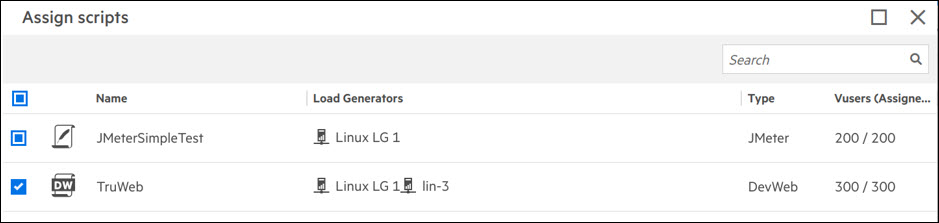 Note: When using the Simple assignment method, you can assign only scripts of the same type to a load generator. If a script is already assigned to a selected load generator, only scripts of the same type are available for assignment. Scripts of other types are unavailable.