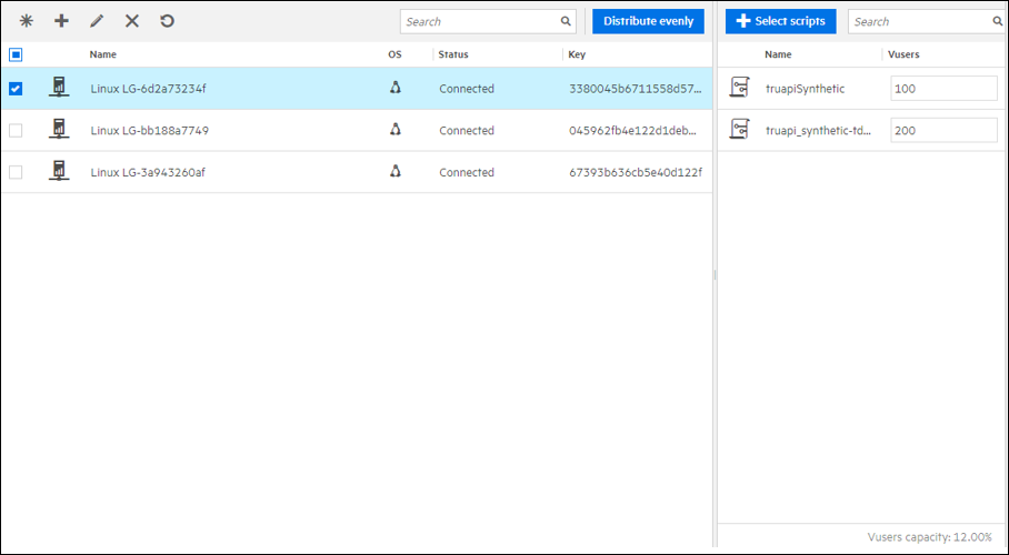 Script name # of Vusers LG assignment # of Vusers running after clicking Distribute evenly Script-A 100 LG-1 100 on LG-1 Script-B 200 LG-2 200 on LG-2 Script-C 300 LG-1, LG-2 150 on both LG-1 and LG-2 -