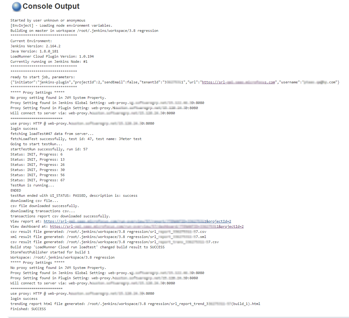 Note: If you terminate a Jenkins job that includes a running load test, the plugin attempts to stop the load test and download any results files (such as XML or CSV files), if they are available. This attempt may fail in the event of network problems, or if Jenkins ends the job before the plugin can stop the load test.
