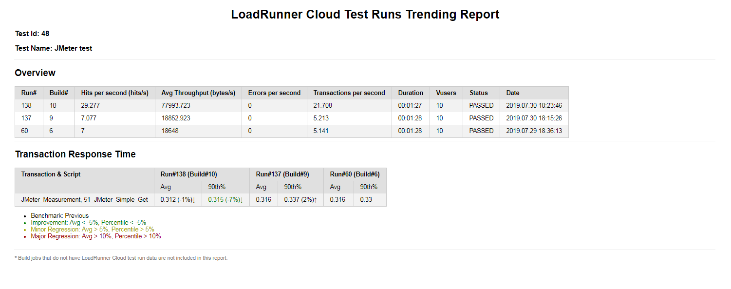 The report is displayed, showing test run metrics for the configured number of last successful runs and the status (improvement, minor regression, major regression) according to the thresholds you set.
