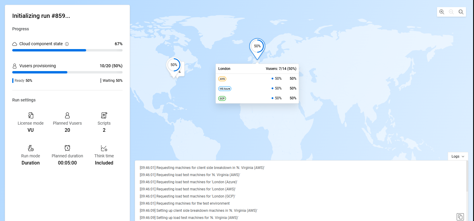 An Initializing pane and a distribution map open. The Initializing pane shows the progress of cloud component deployment and Vuser provisioning. It also shows the Run settings, such as the run mode, number of scripts in the test, and the planned duration.
