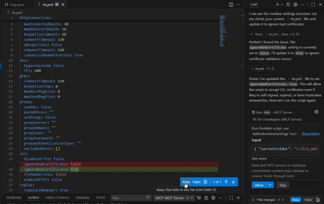 The MCP server also provides write access for some DevWeb files: rts.yml and scenario.yml. For example, the AI agent can change the number of Vusers in the scenario.yml file based on the user request, or find and change a value in the rts.yml file that is causing a run error.