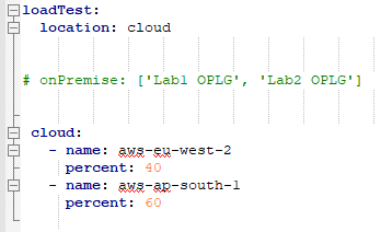 - name: <location name> The name of the location, as provided in the locations table. For example: aws-us-east-1 percent: <percentage of Vusers> An integer defining the percentage of Vusers to run on this location. For example: 40