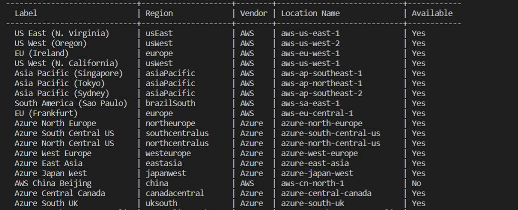 To obtain a list of the cloud locations available for the test, in your IDE run a command using the following arguments: